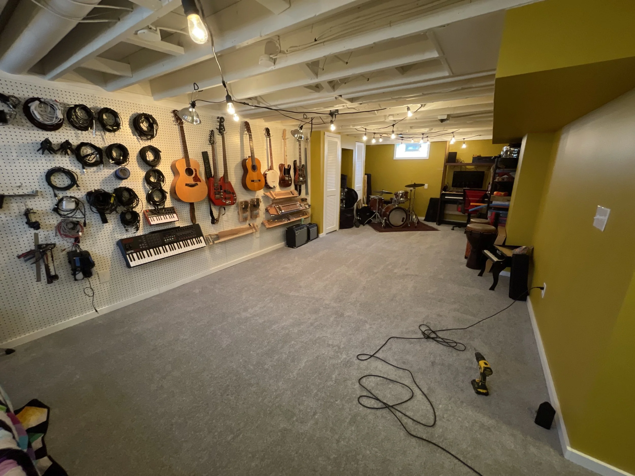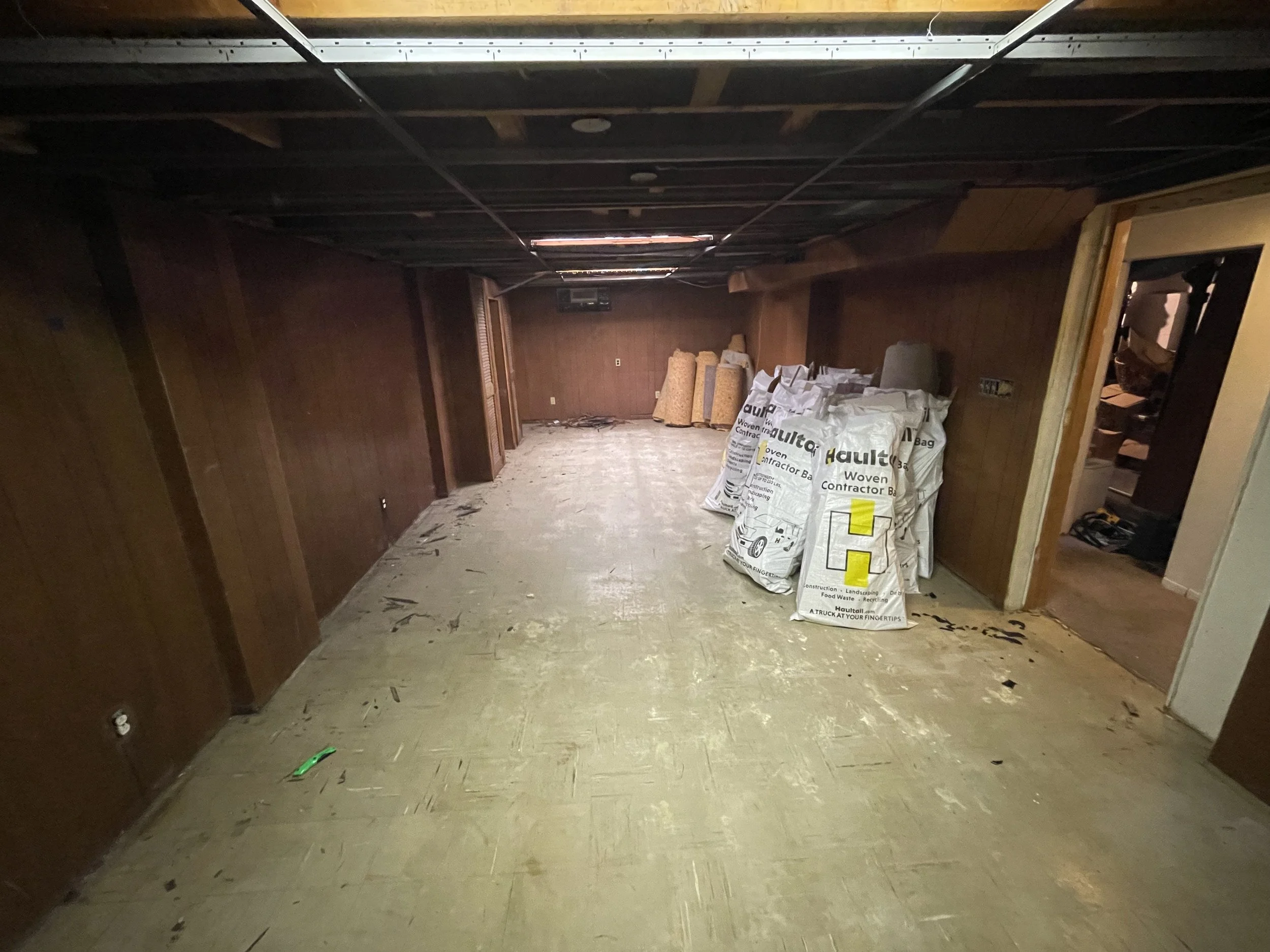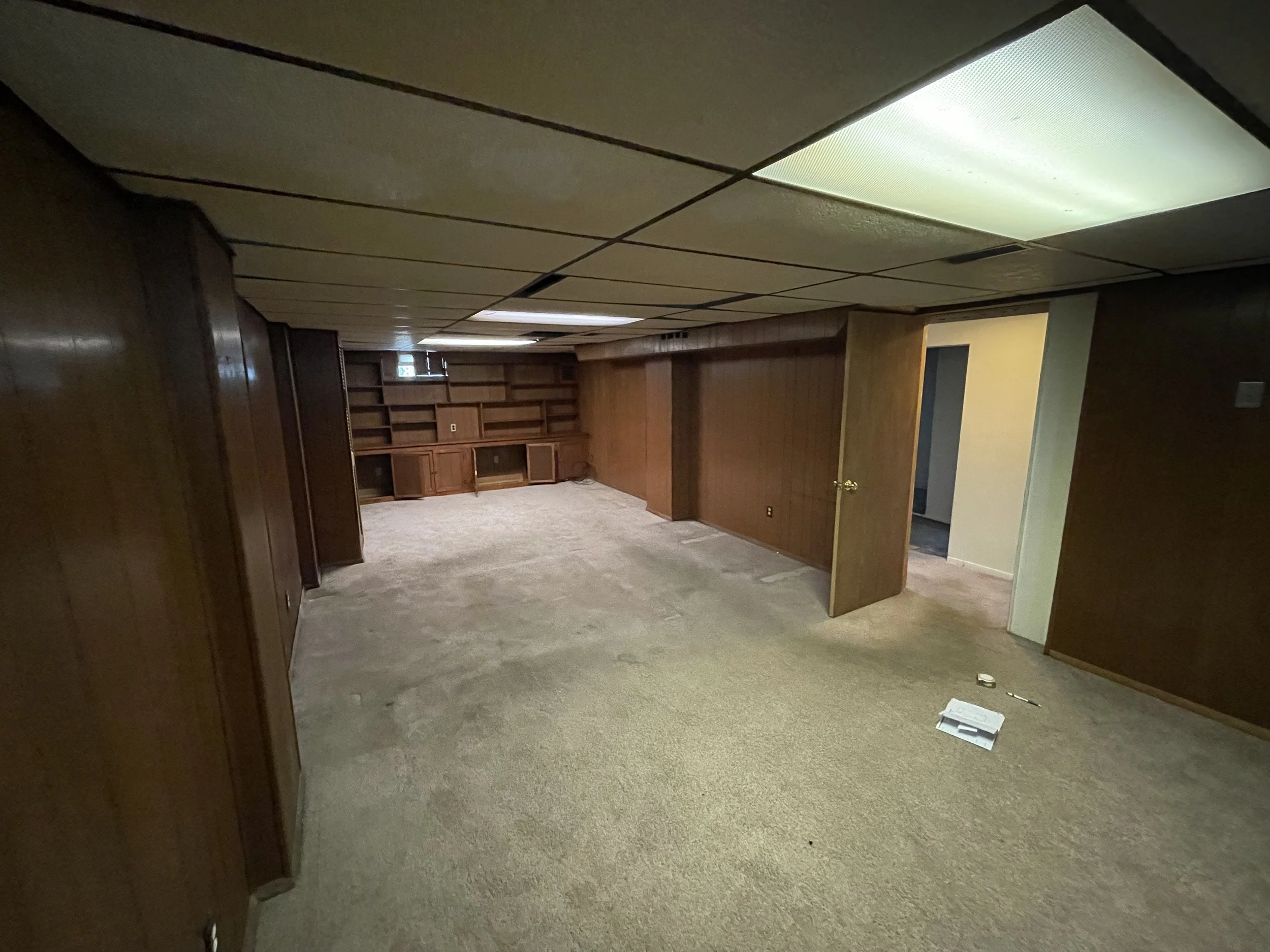 Removed existing wood paneling, drop ceiling and carpet. Installed drywall, peg board wall and trim. Painted ceilings and walls. Minor electrical work.