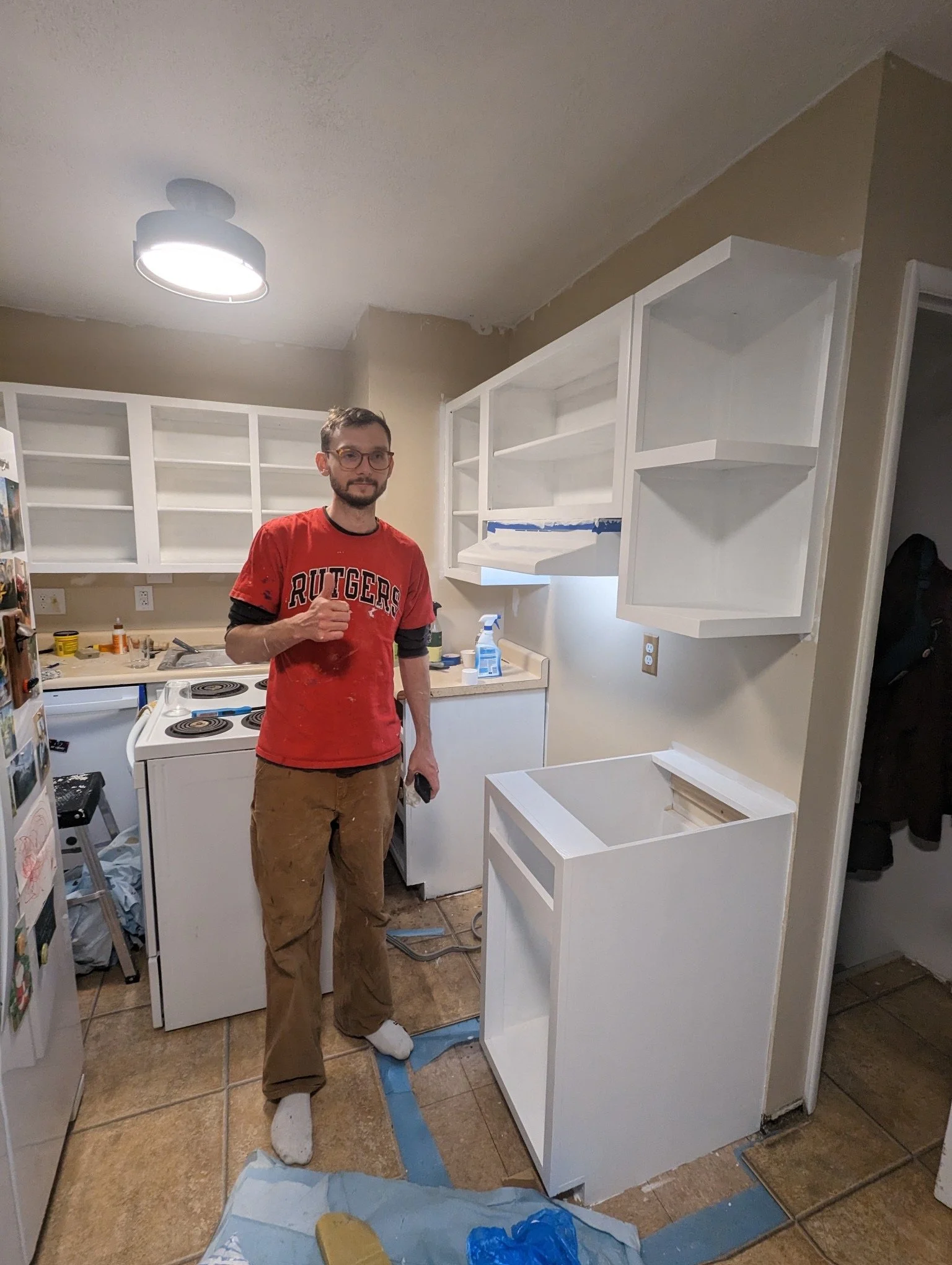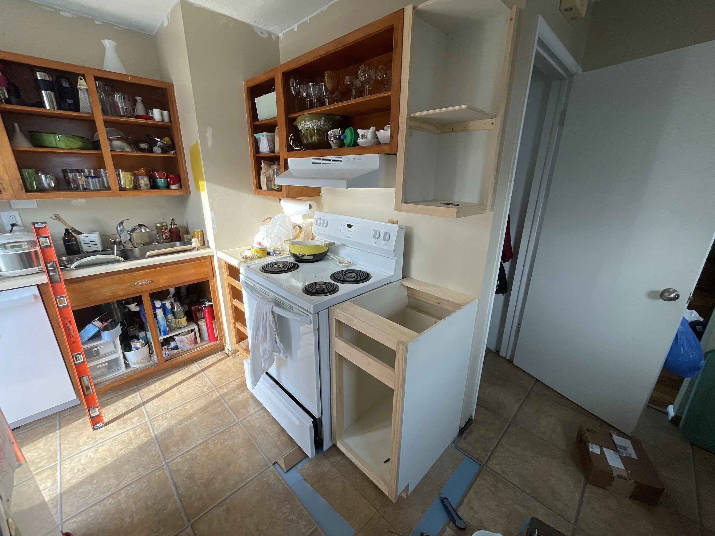 Removed existing flooring. Sanded and repainted cabinets. Built custom shelf and cabinet to right of stove. Installed flooring and trim.